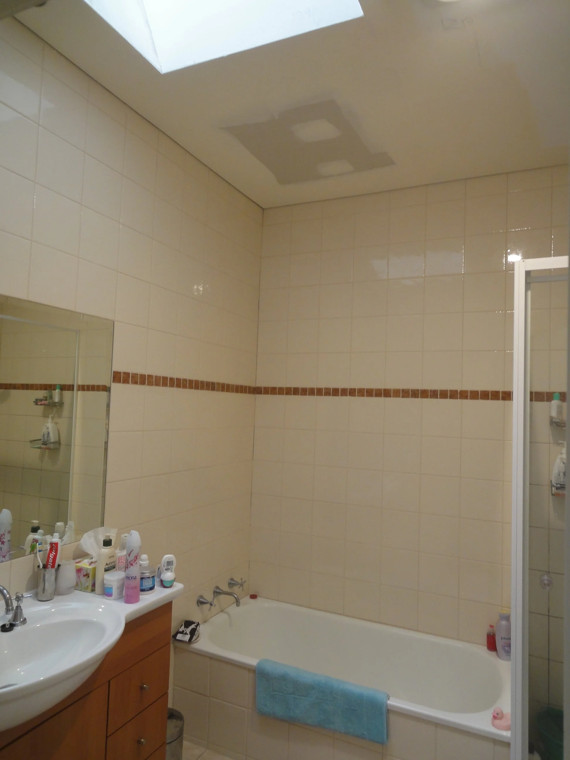 First floor bathrooms with bold references to mid-century colours and planar shapes.